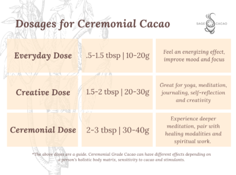 If you are interested in taking a full Ceremonial Dose, we recommend starting with an Everyday Dose 4-5 times, increasing the dose at your own pace and comfort. The full Ceremonial Dose is very strong and can cause a headache and nausea if you are not used to ceremonial cacao. Approach Ceremonial Grade Cacao with awareness and respect of your own body.